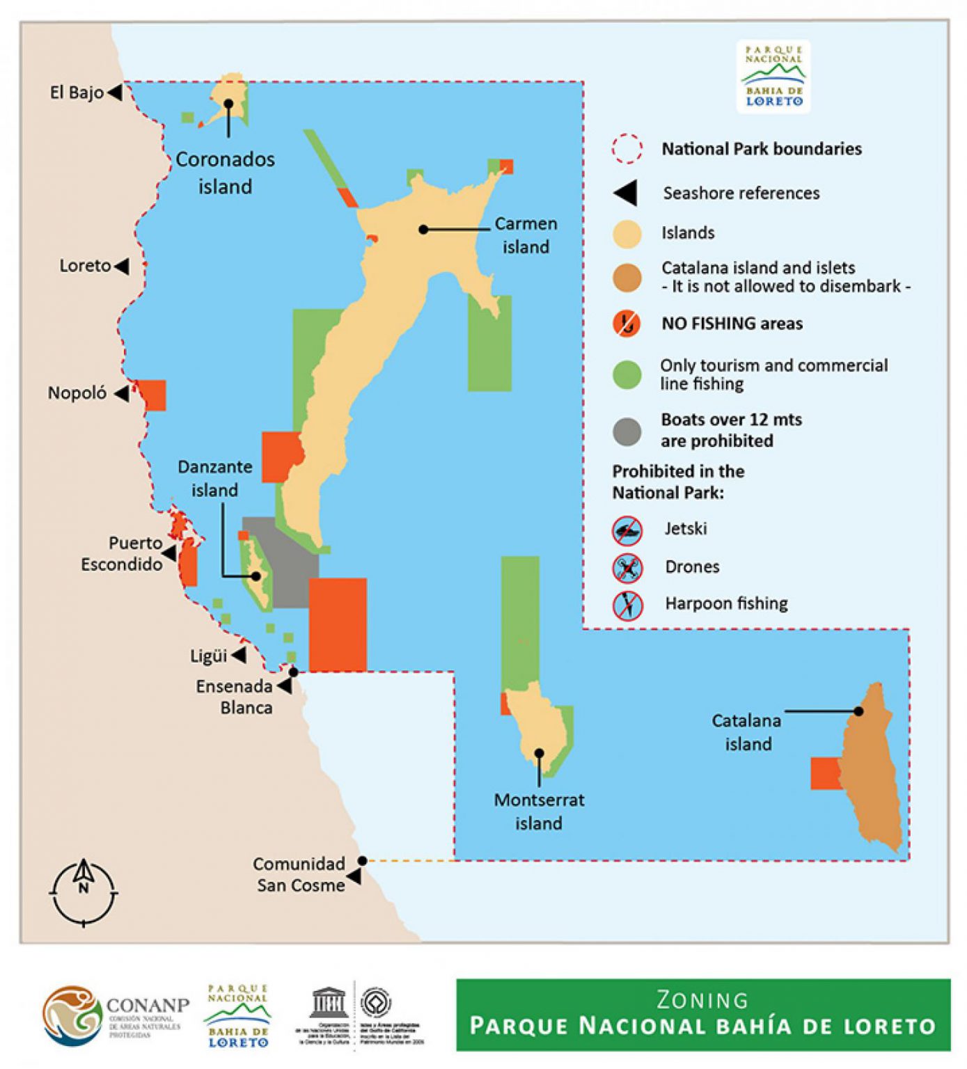 Hablar del uso de sus recursos naturales, es hablar desde las culturas prehispánicas, quienes lograron armonizar el aprovechamiento de los recursos marinos y terrestres con sus necesidades. En la actualidad, directa o indirectamente, la comunidad loretana vive del Parque Nacional. Los usuarios, conscientes de ello, impulsaron su creación en 1996. La modificación del segundo Programa de Manejo en 2019, fue a través de un amplio proceso de participación activa de los diferentes sectores: pescadores, prestadores de servicios turísticos, instituciones de gobierno, académicos, organizaciones de la sociedad civil y público en general. Las opiniones y sugerencias obtenidas en mesas de trabajo, fueron incorporadas a su Programa. Este documento se diseñó en colaboración con los diferentes sectores involucrados y con la población, estableciendo las actividades permitidos y no permitidas, a través de una zonificación. Los usuarios son quienes propusieron al gobierno nuevas reglas de uso.
